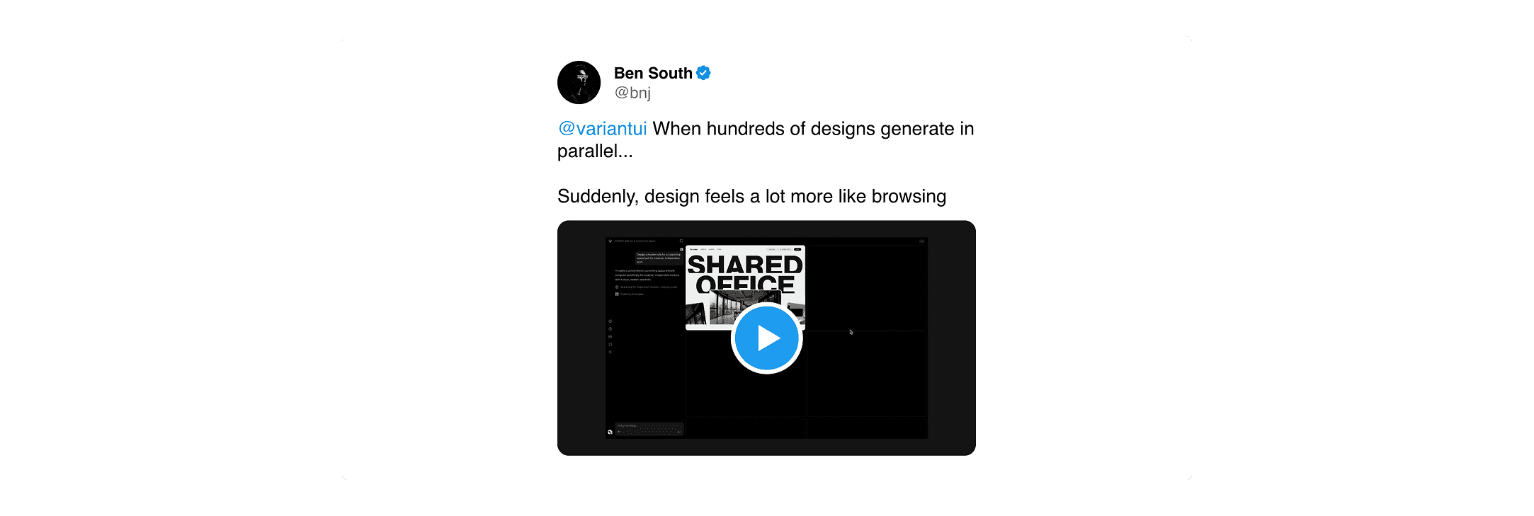 Some people are already trying to build towards this. Variant UI is working on parallel generation, scroll through variations, design as browsing. All of this we believe to be the right direction. Claude Code Playgrounds is another good example - visual feedback loops, and the ability to generate an artifact and iterate on it. Nonetheless, it's still a one-artifact experience, which prioritizes tiny, incremental refinement over more deep and expansive exploration.