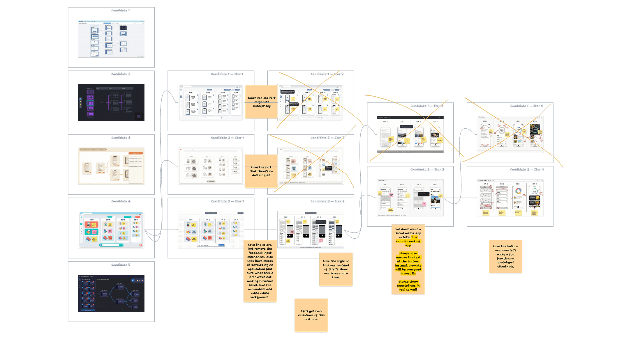 Design nowadays is a sibling to browsing and scrolling. The language of inspiration is the "board", except that it's always been fed to you with little space for your feedback. The idea is to subvert this: you have an idea, you generate plenty of throwaway images, and then you curate what you like. You edit, mark out parts that you like and don't like. You slowly pare down and converge to a more unified idea, and then branch out again, iterating as many times as you like.
