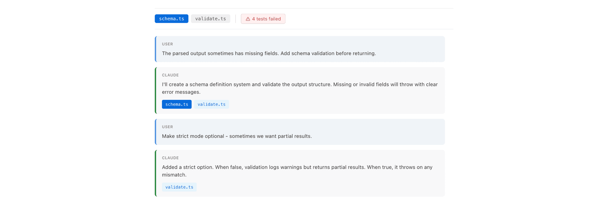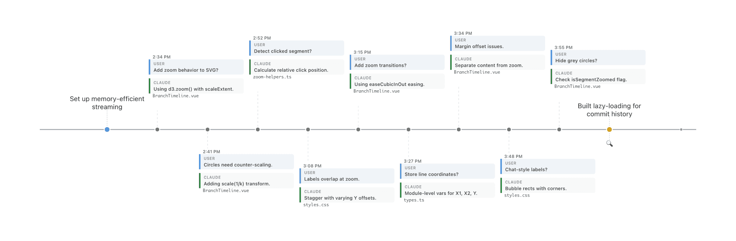 Intermediate points between these “highlight” snapshots show a clear breakdown of the prompting story - we can quickly get a glimpse of the story behind a more specific point in feature development, as well as files that have been touched along the way.Knowing Your Coworkers