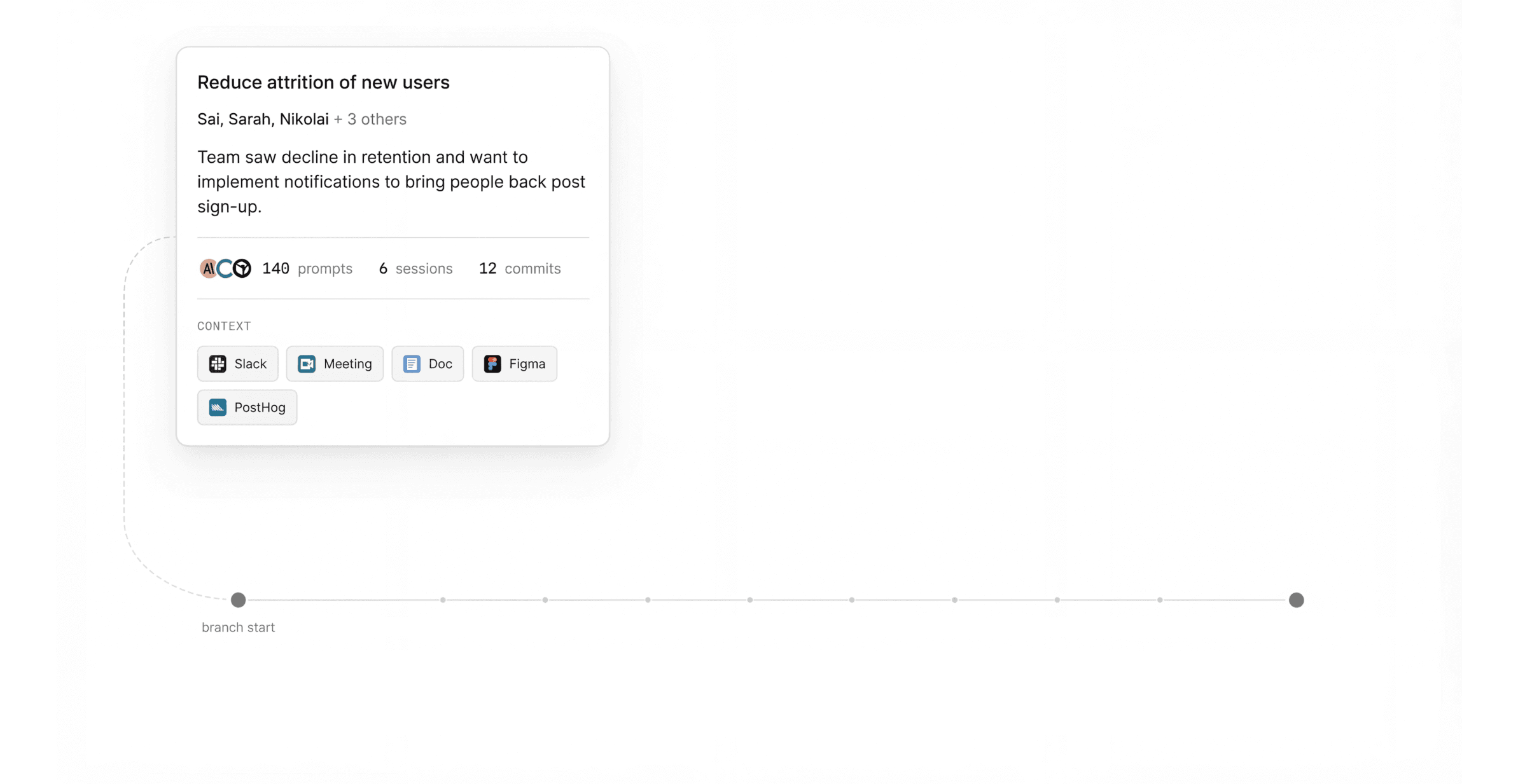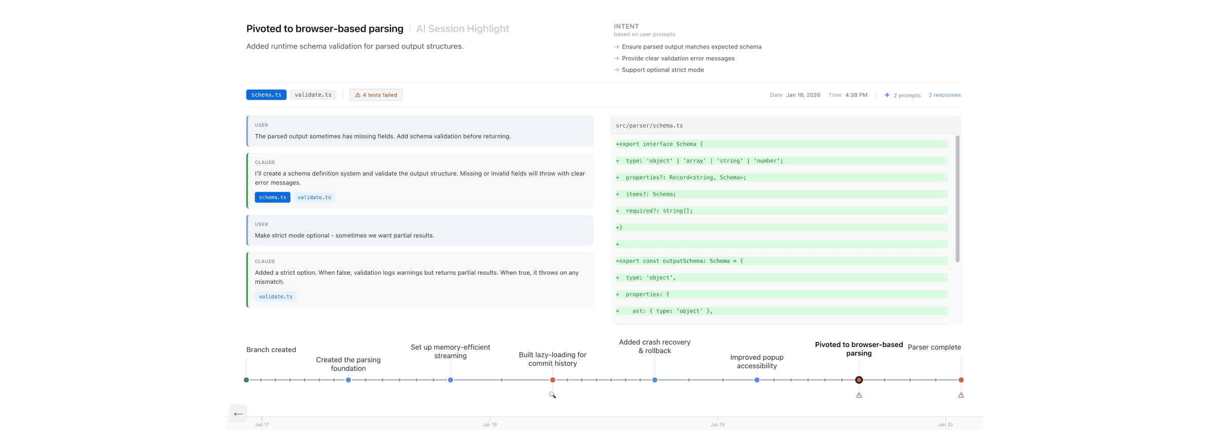 Clicking on any of the other points along a branch brings up what we call an AI session highlight - a step along the way to the final commit. We surface these steps based on signals that indicate a particular part of the conversation between engineer and LLM was meaningful to the work being done.