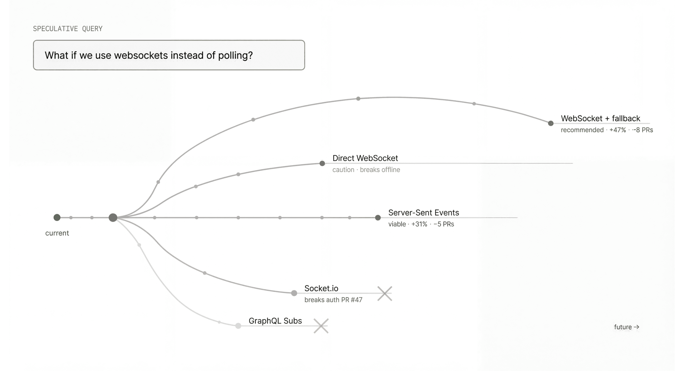 If you can see the narrative history of a codebase, you can also model its future. You could plot a change and see what it might mean across thirty pull requests in that direction. You could explore different paths before committing to one.