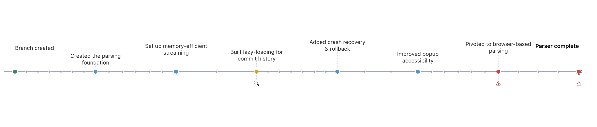 The top-level timeline shows key milestones - abstract enough that anyone, technical or not, can understand what features are being developed and who owns what. Zoom in and more is revealed. Each level matches a different stakeholder: executives see feature ownership and velocity, managers see what engineers are working on and why, engineers dig down to the non-abstracted truth of the repo.