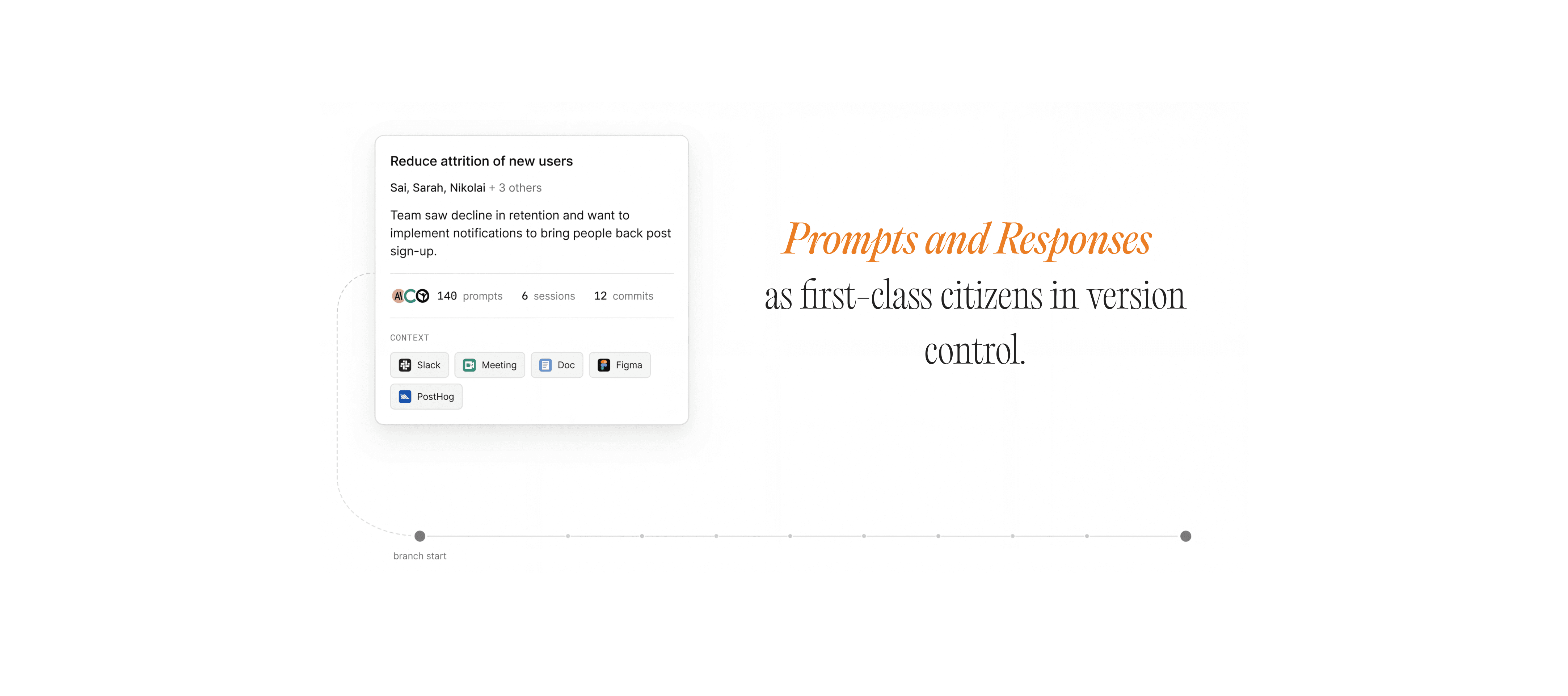The interface treats prompt and response as first-class citizens in version control. It surfaces the narrative thread that connects changes. It provides progressive disclosure from intent to implementation. We are exploring how context from outside the codebase can be integrated, how timelines can be projected forward, and how collaboration can happen across levels of technical fluency.
