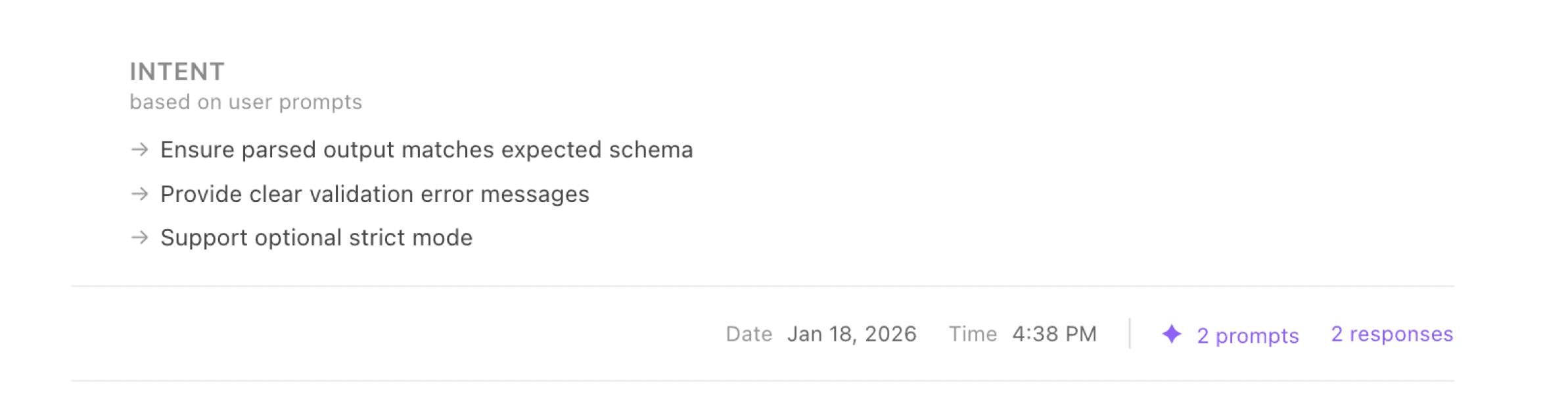 We also surface intent: derived from both the diffs and the conversation between engineer and LLM. This isn't a retroactive explanation of what happened, but a summary of the ideas as they were crafted in dialogue. You see the most important session excerpts, the files changed, and the corresponding diffs.