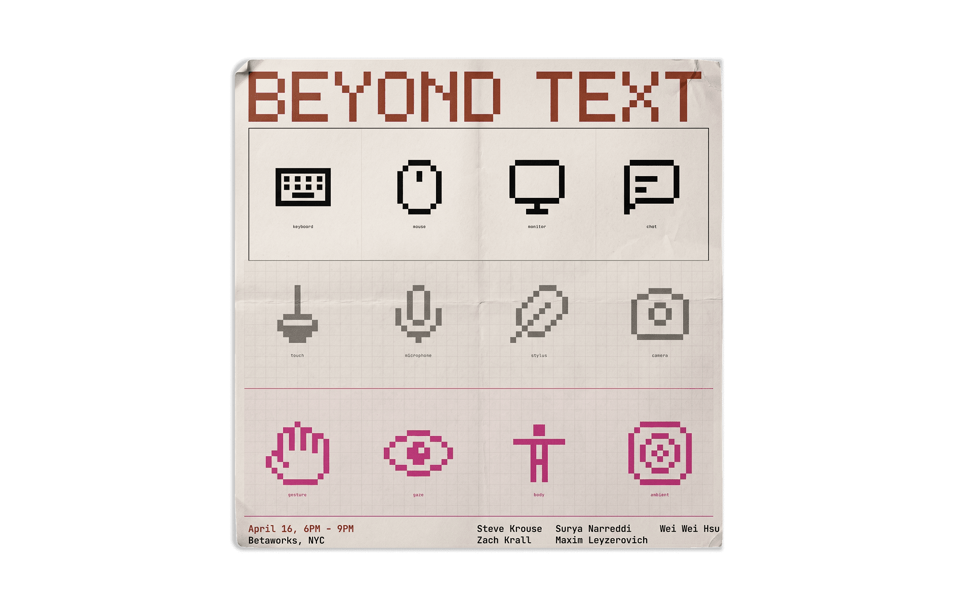 Beyond Text was a conference at Betaworks in New York on emerging input and output modalities for AI. The premise of the evening was that typing is the first interface to AI, not the last, and that what comes next is voice, gesture, multimodal and embodied interaction.