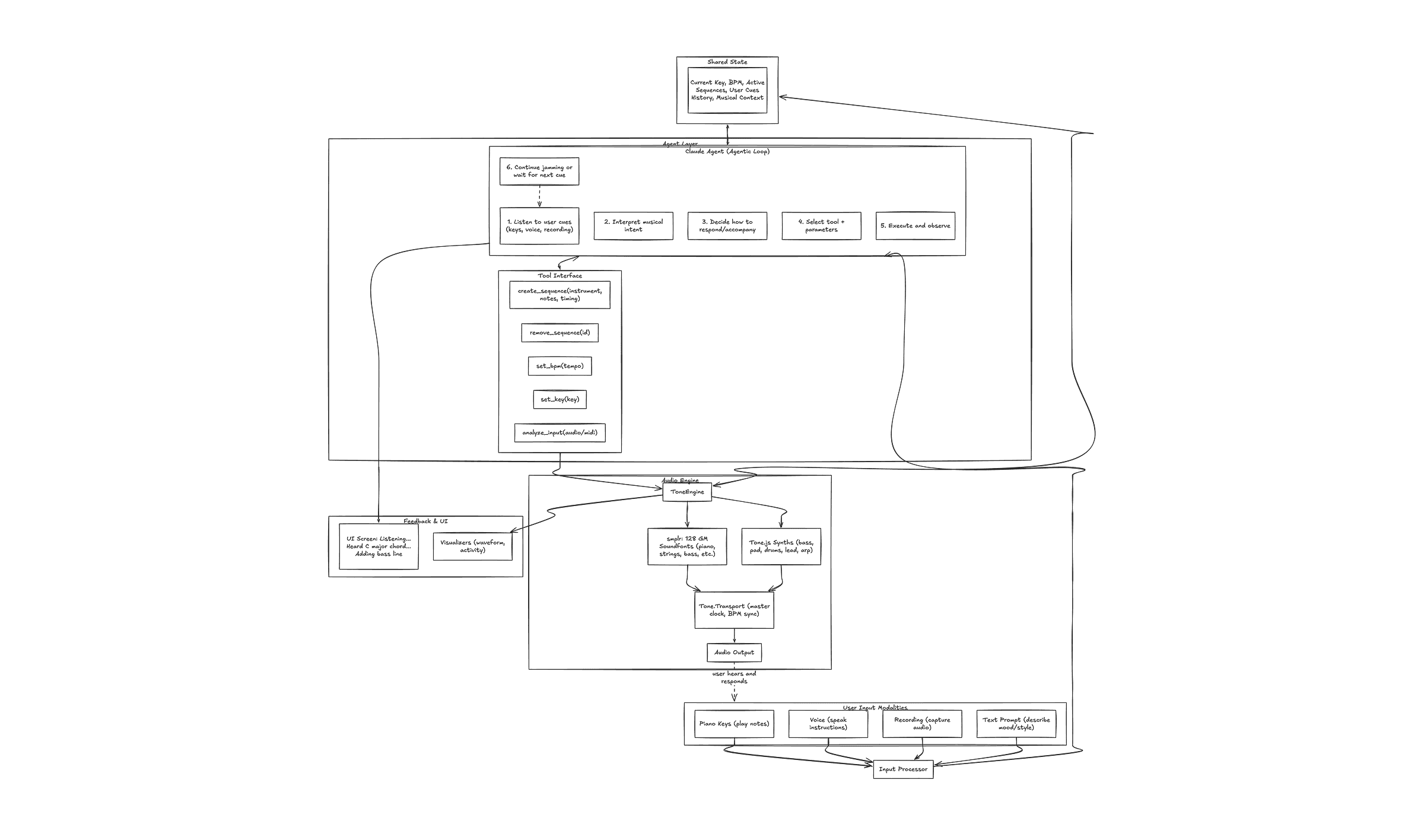 The agent runs in a loop. It listens to your cues, interprets your intent, selects the right tool (creating a sequence, changing the key, adjusting BPM), executes it, and waits for your next move. The tool interface connects to the ToneEngine, which handles both acoustic instruments through 128 GM soundfonts and electronic sounds through Tone.js synthesizers. Everything syncs to a shared clock so the timing stays tight.