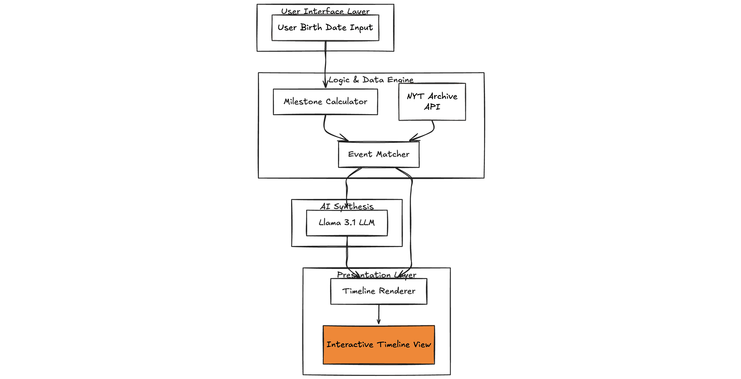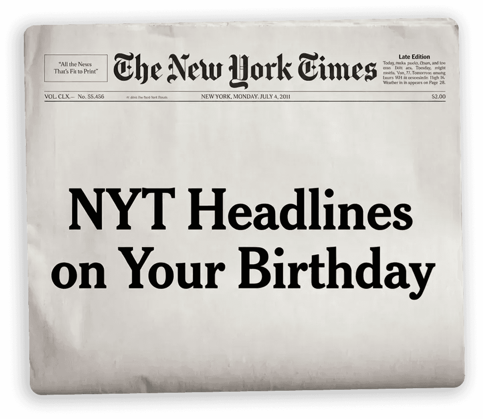 The system draws from an archive of New York Times headlines spanning decades. When a user enters their birthdate, a matching algorithm finds headlines published on or near each milestone date. For each milestone, Llama 3.1 receives the headline and the age context, returning a lyrical phrase that bridges the two. The timeline renders as an animated vertical scroll with alternating milestone cards, each linking to the original article.