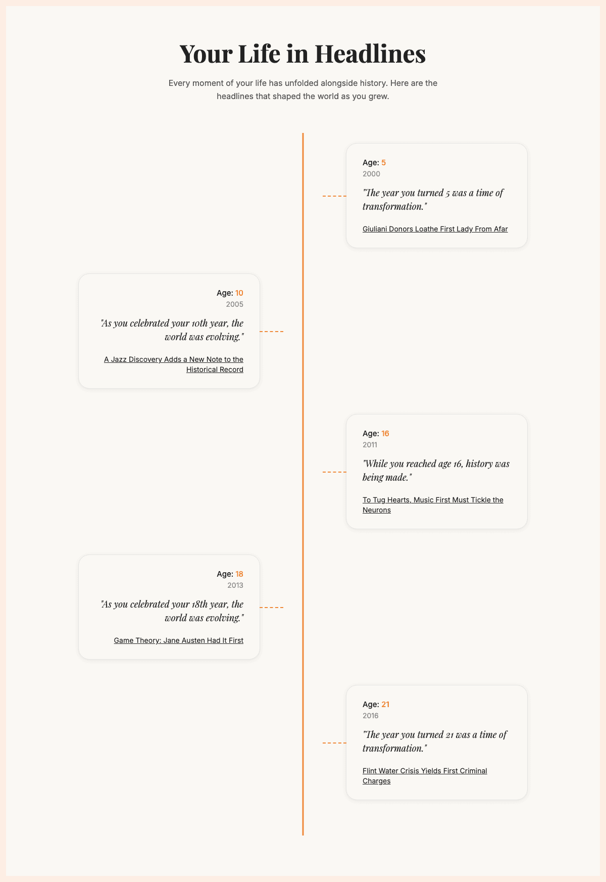 Built at the world's shortest hackathon in July 2025, this personal timeline generator weaves together individual milestones with the stories shaping the world at that moment. Enter a birthday, and the application finds real newspaper headlines from that exact day and subsequent milestone ages (5, 10, 16, 18, 21). An AI then generates poetic "connections" between the personal and the historical. Each headline links directly to the original New York Times article.