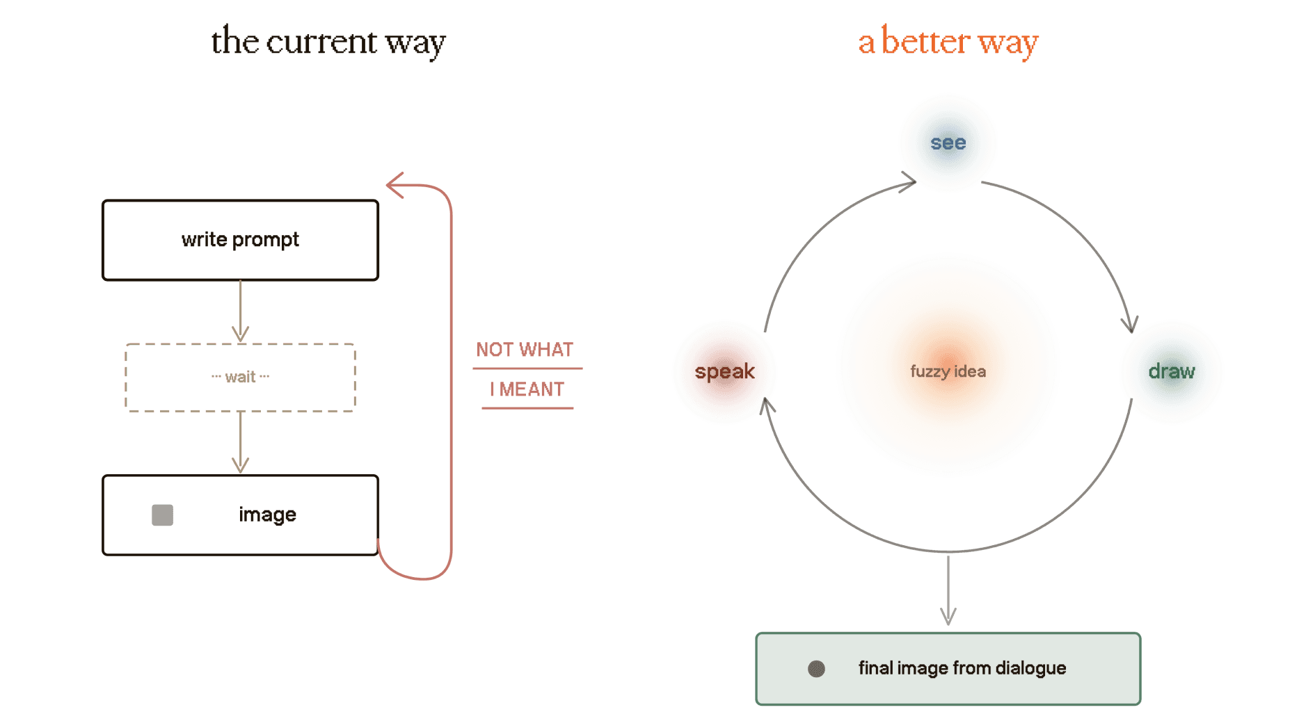 What if image creation were treated as dialogue, not transaction. You speak and draw simultaneously, operating in two registers: voice which is semantic, gesture which is spatial. The tool triangulates meaning from both. The gap between what you meant and what it heard is where the conversation happens. You learn the tool's language. It learns yours. The image is a trace of exchange.