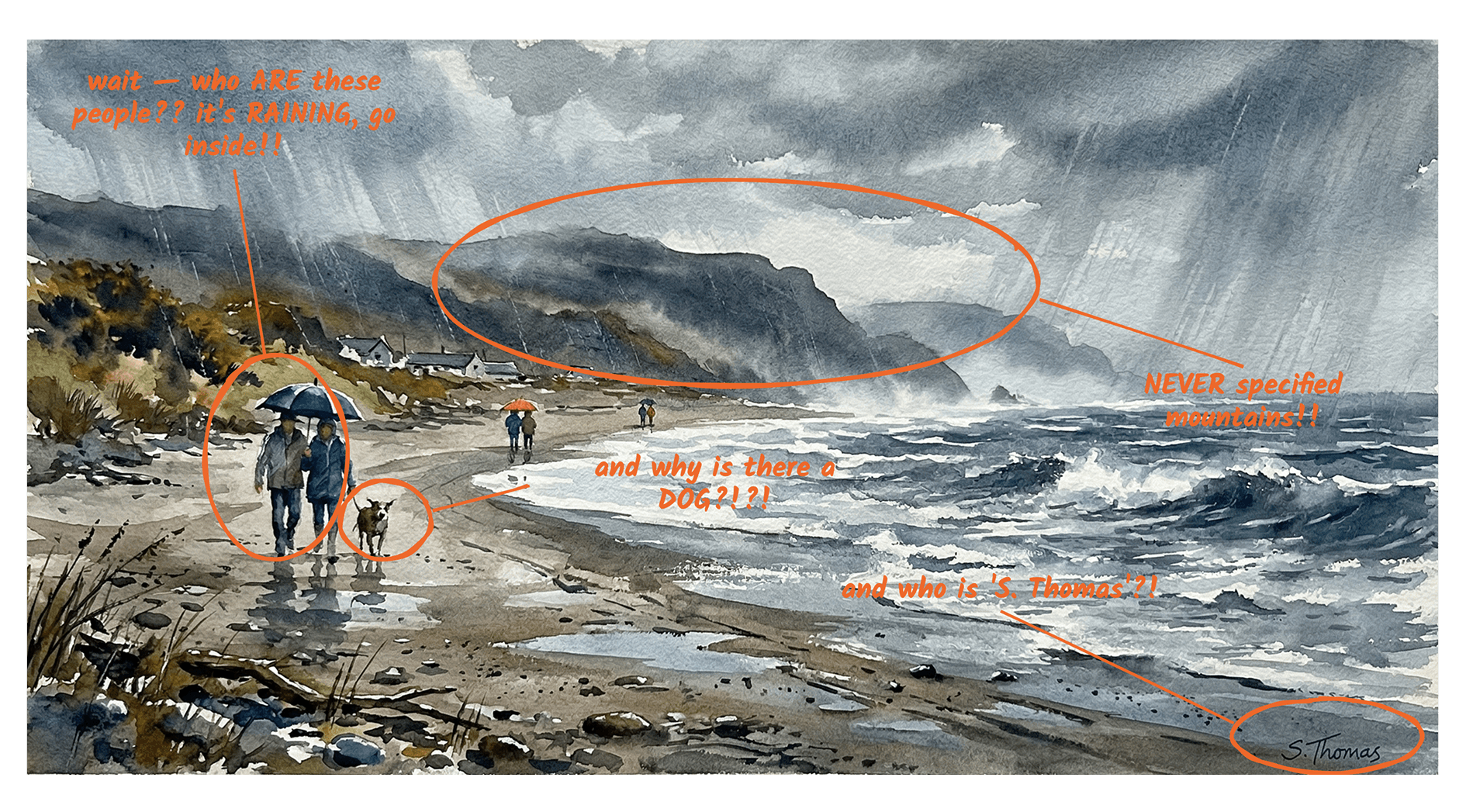 Ideas are fuzzy, creative kernels that aren't fully formed. The moment you send a prompt, the model takes that kernel and crystallises it. The gaps get filled with what is statistically likely. A couple with an umbrella. A dog. Mountains you never specified.